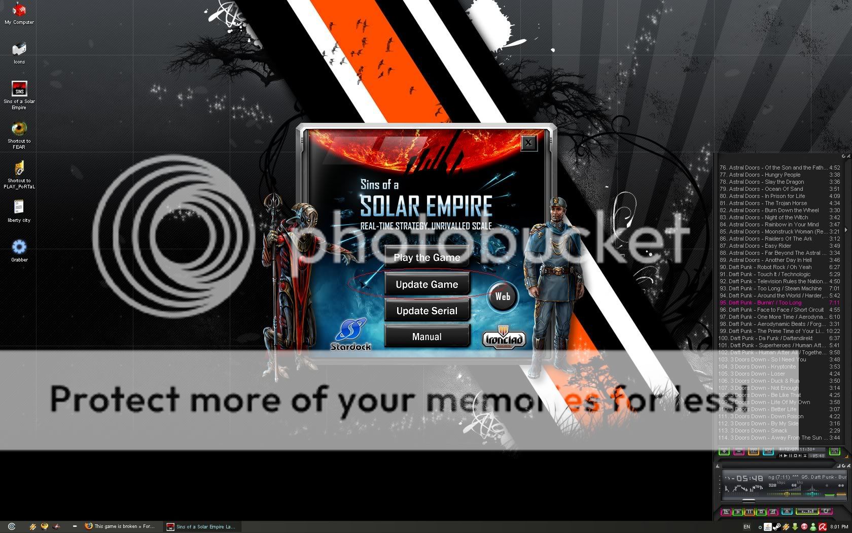 Ok so many of you want to know my computer specs. I have a AMD 2100+ CPU, 2GB RAM, ATI Radion 9800 Pro with 256MB RAM, SB Audigy 2 ZS, and running Windows XP Pro. Like I said it’s a bit older but more than meets the Min Requirements for this game. So for those that said "get a better/newer computer" you should insted, be telling Stardock/Ironclad that their min requirements are incorrect. As for the frustration of finding a DL link for the patching I went back and looked again for a link on their home page. https://www.sinsofasolarempire.com/ Sorry still don't see a button for it. Or directions to get to it. Doesn’t really matter though, anyone can Google and find the link. And yes I still do think it is BS to force a customer that just purchased one of your products to register the game to get ANY support for that product. You can't even DL patches to FIX the game that should already be working when you buy it, unless you do so. Don't get me wrong if I thought that I was the only one, or even just part of a small hand full of consumers that was having this problem I wouldn't be so upset. But as I stated earlyer its dose not appear to be a little or infrequent error. Sorry about my original post not having paragraphs. Didn't realize I was back in college in constructive wrighting 101. And for the rest of you who had nothing but criticism about my frustrated postb and no advice or anything positive to say about it. Put your self in my shoes. How would you feel if you purchased something that your were able to use once and then can't use it again. example (a TV that turned on but then the next time you tried, you find out you have to take it back to the store to get it fixed. But when you go there the repair man says "Sorry we are working on getting something to fix that with, but it will take a few months.")Sorry for any typos miss spelling or any other grammatical error GEZZ. Their would be loads of peeps wanting to help you its a very friendly if lively communityLook at the replies. lol, yeah real friendly. :edited for a few spelling and grammatical errors
