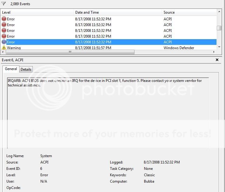 Checking my event viewer reveals that "BIOS does not contain an IRQ for the device in PCI slot --" it repeats that message several times, with the -- being replaced with 22. 19, 23, 24, and 3, all in different messages all delivered at precisely the same time. These come along anytime my computer freezes due to the game.