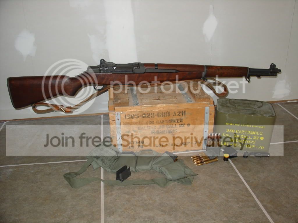And now for pictures! I quickly assembled a small portion of my equipment. The rifle is an M1 produced late during WWII, refitted before service in the Korean War, and then refurbished at San Antonio Arsenal. I refurbished the wood once more. The ammo crate it sits on is of Greek origin, from 1970. It contains two spam cans of M2 ball ammo similar to the one to the right of the crate. M2 ammo is lead bodied with a steel shell to prevent deformation during flight, thus making it armor piercing. The green belt is a Greek bandoleer with cardboard inserts and loaded en bloc clips, of which there are two empty and two loaded nearby. The clip with the silver tipped bullets is loaded with incendiary ammo. The small tube next to the incendiary ammo is a yellow capped container of heavy grease, used to lubricate the operating rod slide, which faces the camera. Next to that is a multi-tool, equipped with a screwdriver to unscrew the gas cylinder (front underside of the barrel), a cylindrical tab used to push out several internal components, and a specialized head to open the entire bolt with one twist.